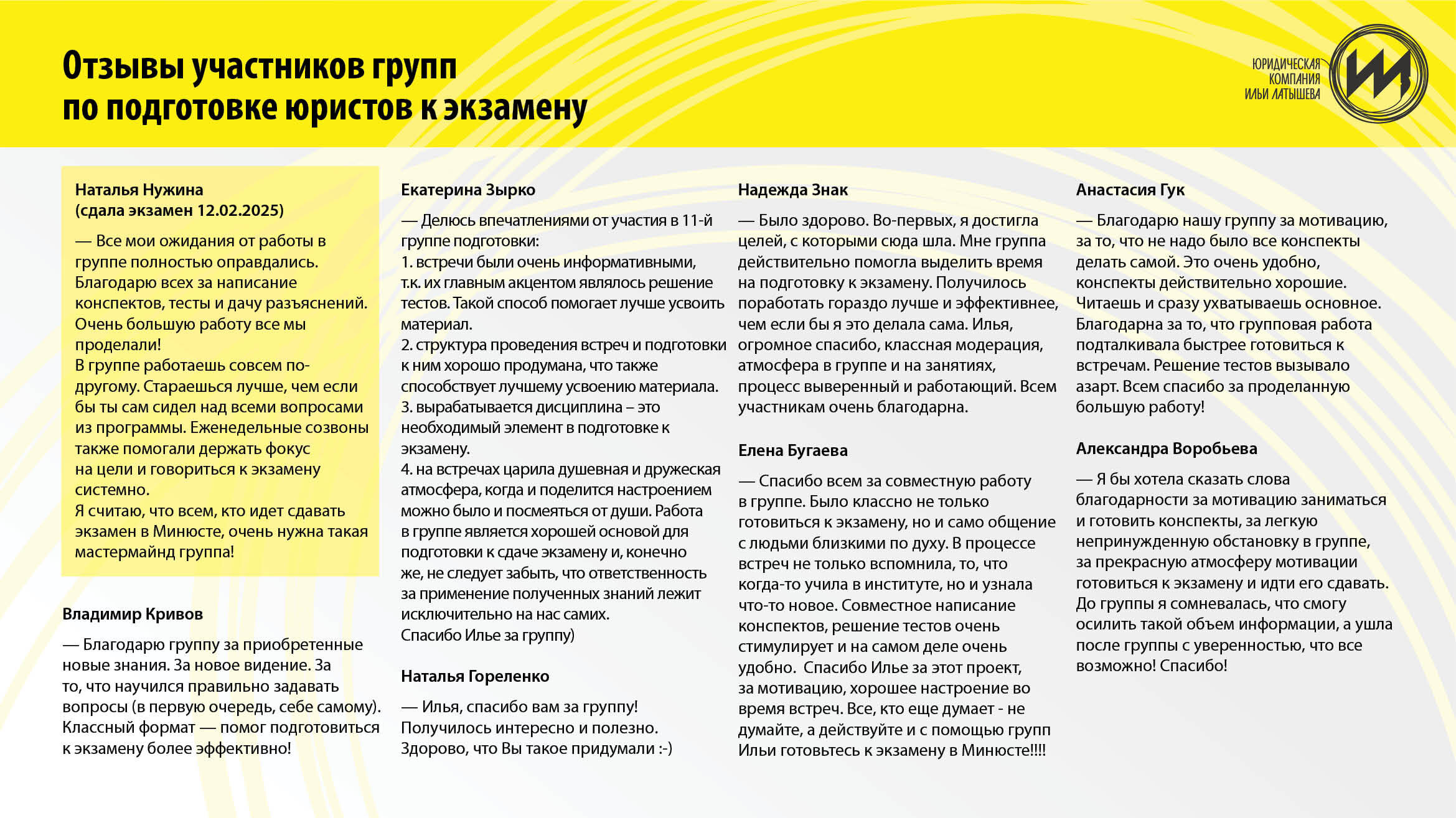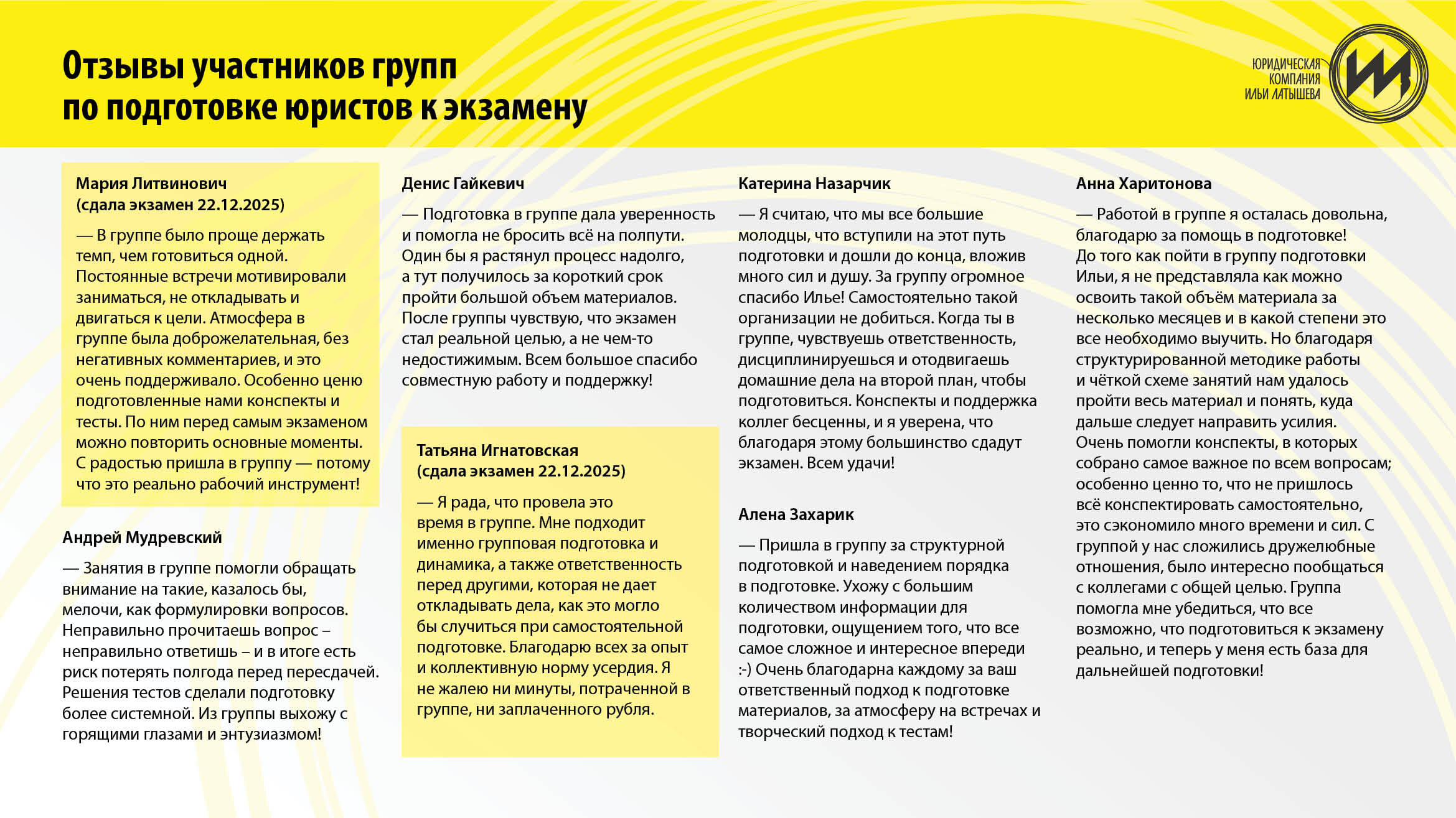 7. Конспекты и тесты предназначены исключительно для целей подготовки к экзамену. Они не являются официальным источником права, юридической консультацией или руководством к действию в профессиональной деятельности. Мы не несем ответственности за последствия использования материалов в практической деятельности юриста.